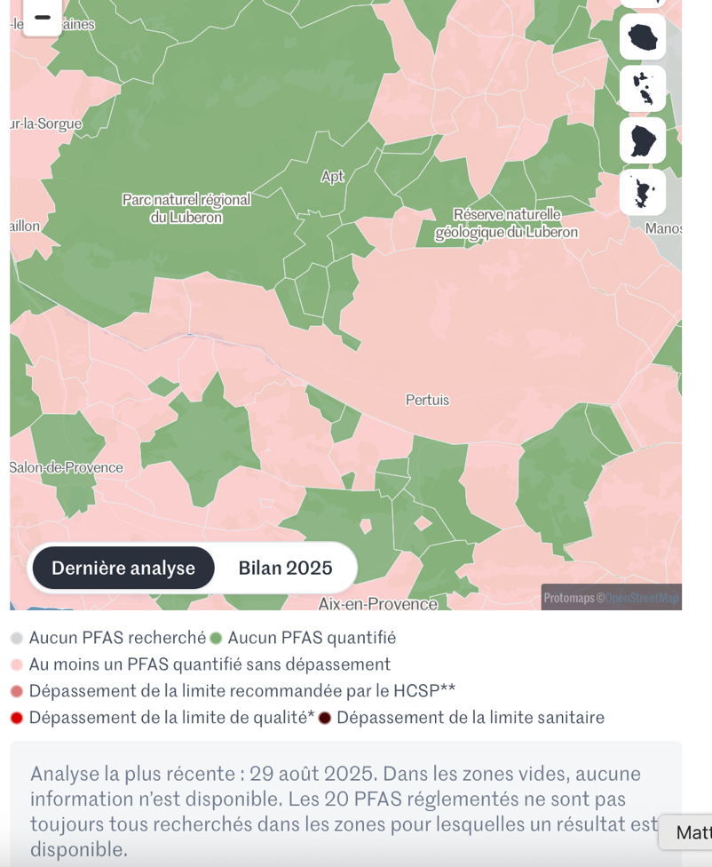 Une carte interactive publiée par Le Monde le 16 octobre 2025, à partir des données collectées par deux ONG indépendantes (Générations Futures et Data for Good), révèle pour la première fois publiquement la présence de « polluants éternels » dans l’eau potable en Sud Luberon.